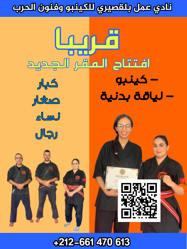 سعيا منا إلى تقديم الأفضل نخبركم أن جمعية نادي عمل بلقصيري للكينبو وفنون الحرب ستفتتح مقرها الجديد الكائن بحي الشاوي مشرع بلقصيري قريبا .